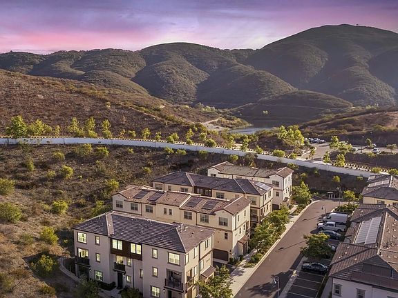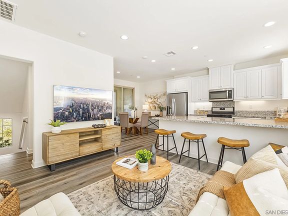 Welcome home to Lazurite Rd in gated Latitude at Rancho Tesoro, a gem set against the scenic hills of San Marcos. From the moment you enter the neighborhood, you’ll notice the meticulously kept landscaping and impressive amenities, including a resort-style community pool with views, loungers, BBQs, fire pits, and more. Boasting owned solar and positioned for privacy, this beautiful 2 bedroom, 2.5 bathroom, 1248 ESF, end-unit townhome offers plenty of natural light and hillside views. Built in 2021 and assigned to Double Peak School, this smart-enabled home with fiber connectivity and upgrades lives comfortably for a variety of lifestyles with an attached, EV-ready two car garage and dual ensuite bedrooms. On the main living floor, the layout flows easily between the kitchen, living, and dining areas, and opens out to a covered balcony that offers a private and serene place to unwind. Centrally located, the spacious kitchen features a pantry and ample counter space, perfect for both entertaining and everyday life. Upstairs, both bedrooms with attached bathrooms are ideally situated, and laundry sits nearby. Thoughtfully designed, the primary suite features a spacious bathroom with walk-in closet, large shower, and dual vanity, and the second bedroom’s ensuite is complete with a bathtub for added convenience. Perfectly located near restaurants, shops, trails, and lakes, and still offering quick access to the 78, Rancho Tesoro combines everyday ease with the beauty of outdoor living for a truly effortless lifestyle in San Marcos.