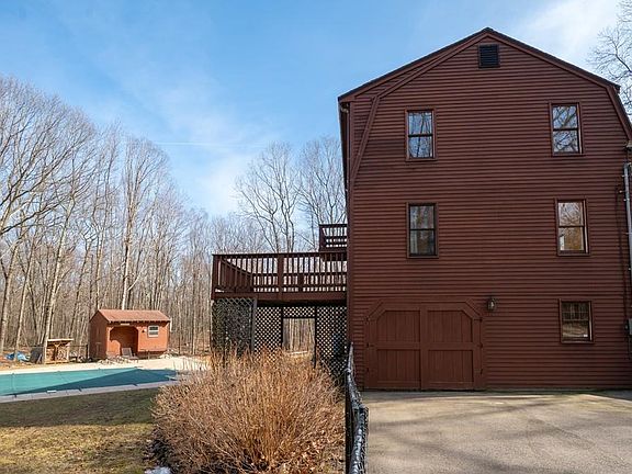 Sutton Gambrel on 1.9 acres on country road. Open floor plan - upgraded kitchen with granite backsplash, counters, island and stainless appliances. Bright dining area with fireplace. Updated bath with laundry. Living room with slider to large deck overlooking the wooded grounds, gardens, inground pool surrounded by patio and pool house. Lower level recently carpeted has propane fireplace and walk out. One car garage attached. Second floor has front to back master with additional deck, 2 other large bedrooms - all newly carpeted & full bath. Interior recently painted. New water heater, water filtration unit and upgraded electrical. New pool filter,motor and liner - Ready for summer. Two driveways allow for your overflow parking at your pool parties! Easy access to highways.
