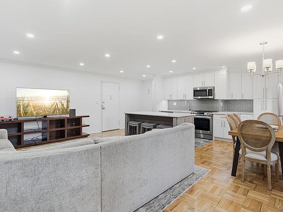 Inside the apartment, recent upgrades create a fresh, modern feel. The kitchen has been opened from a galley layout to an airy open floor plan, while both the kitchen and bathrooms were remodeled within the past year and a half. Ceilings have been updated throughout, adding to the home’s clean, contemporary appeal.