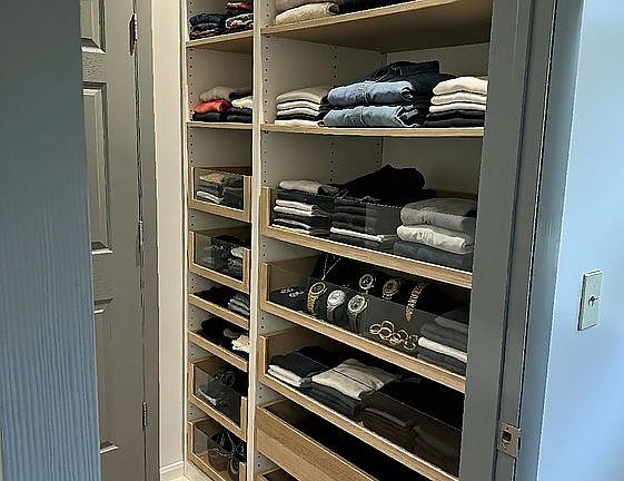 The primary suite features a custom walk-in closet designed for both beauty and function.