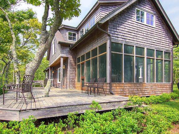 An immaculate South Mountain built home on 6 acres and including coveted pond frontage on Thumb Cove.The property is adjacent to more than 600 acres of conservation land at the Long Point Wildlife Refuge. Enjoy exploring the Tisbury Great Pond by kayak or small boat and across to pristine south shore barrier beach right from your property. One enters the home through a central hall that leads to the thoughtfully planned living rooms and entertaining spaces. There's an open plan kitchen, with separate pantry room, and dining room with doors to both the screened porch and sunny deck overlooking the pond. The living room is punctuated by a tasteful fireplace and vaulted ceiling. The master suite is on the first floor comprised of office, full bath, custom built in closets and bedroom facing the pond. Two further bedrooms are on the second floor with shared full bath and each have pond views. The laundry is upstairs. Beautiful Maple floors and custom woodwork detailing from salvage Cypress and Douglas Fir are an integral part of this well built home. The house offers total privacy on 6 acres with tasteful landscaping, an established vegetable garden and of course the pond to enjoy.