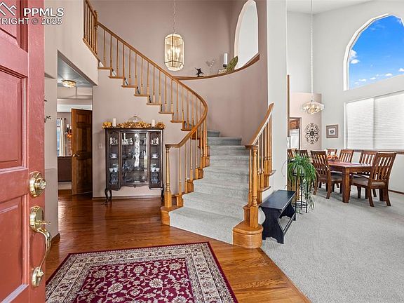 Perched at the end of a quiet cul-de-sac in the sought-after Gleneagle community, this home offers breathtaking mountain and Pikes Peak views from every level of the home. With over 4,400 finished square feet, this six-bedroom, four-bathroom residence perfectly blends spacious comfort with Colorado elegance. Step inside to soaring vaulted ceilings, warm natural wood accents, and large picture windows that capture the sweeping mountain panorama. The living room features a cozy fireplace and a walk-out to the back deck—perfect for taking in sunsets over the Front Range. The kitchen offers a welcoming eat-in layout with tile countertops, a large island, and ample storage, opening seamlessly to the dining and living spaces. The primary suite upstairs includes a sitting area, fireplace, and spa-like five-piece bath—all while overlooking those same expansive views that make this home unforgettable. The walk-out basement features a full wet bar, family room, and additional bedrooms—ideal for guests or entertaining. Outside, enjoy a private backyard that backs to open space, providing unobstructed views of Pikes Peak and a peaceful sense of seclusion. With a three-car garage, tile roof, and low annual HOA, this home is move-in ready and built to enjoy everything Colorado living offers. Located in Academy District 20, near parks, trails, and shopping—this is where space, serenity, and scenery meet.
