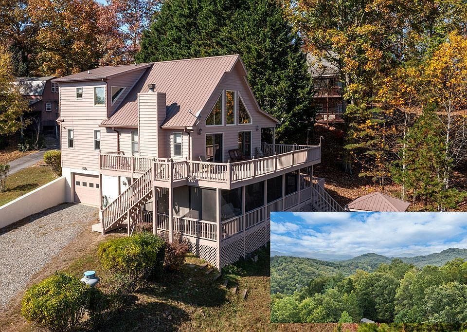 AMAZING MOUNTAIN VIEWS Experience breathtaking mountain vistas from this stunning 3-bedroom, 3-bath chalet situated in Cedar Ridge, just a short drive from downtown Murphy. The expansive deck offers panoramic views in every direction, making it an ideal spot for relaxation or entertaining. Inside, the open-concept design features a bright and airy kitchen, dining area, and living room, all bathed in natural light from the chalet-style windows. This main level also includes a guest bedroom, a bathroom, and a laundry room for added convenience. The primary bedroom and bath are located in the loft upstairs, while the basement offers an additional bedroom and bath, perfect for accommodating guests. The property is further enhanced by a one-car attached garage, a shed, a fire pit, and an inviting porch swing, all set against the backdrop of the stunning mountain landscape.