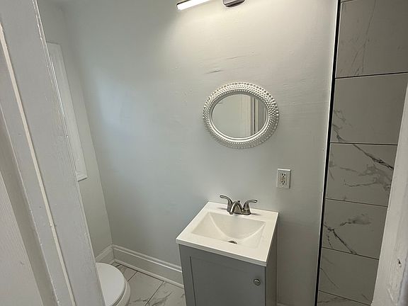 Modern finishesStainless steel appliancesGranite countertopsBathroom with tile flooringBright kitchen
