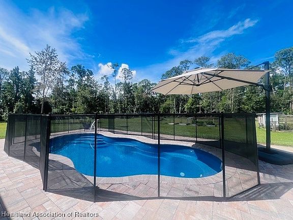 MOTIVATED SELLERS!! Welcome to your new 5 acre homestead. NO HOA's here! Just peace and quiet with lots of room to roam and endless possibilities. This beautifully designed, newer construction, concrete block home features three bedrooms, two bathrooms, a garage, inground pool, paver deck, screened in porch and plenty of room for all of your toys or animals. With a durable metal roof, you can enjoy peace of mind and low insurance rates. Nestled on a generous 5-acre lot, this property offers endless opportunities for outdoor living. Take a dip in the sparkling inground pool (just under two years old) or relax on the paver pool deck, ideal for entertaining friends and family. The screened-in porch invites you to enjoy the serene surroundings while keeping the bugs at bay. Gardening enthusiasts will appreciate the established garden complete with raised beds, perfect for growing your favorite vegetables and herbs. Plus, there is a chicken coop and animal pen, catering to your homesteading needs. This home is less than 4 years old and the additions/upgrades seller has added are... the inground pool with large paver deck, new gutters, extended concrete driveway for extra parking, new culvert and gravel drive for second entry into the property, water treatment system, metal shed to protect water treatment system and pool equipment, irrigation/sprinkler system, 50 AMP outlet on exterior wall near garage, new refrigerator, new washer and dryer, raised garden beds, chicken coop, small animal pen. This unique property is not far from the Highlands Hammock State park and is only a 15-20 minute drive from downtown Sebring (recently featured on HGTV), downtown Lake Placid and the beautiful Lake June. Don't miss out on this rare opportunity to own a slice of paradise that combines modern living with the charm of rural life. Schedule your private tour today!