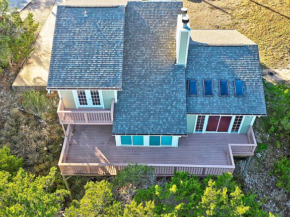 This 3 bedroom, 2 1/2 bath home is ready for its new owner and would be ideal for a full time resident or someone wanting a weekend river getaway. The main floor consists of Saltillo tile throughout, tons of natural light, vaulted ceilings and multiple sliding doors onto the back deck. The updated kitchen has granite countertops and all stainless appliances. The primary bedroom also has vaulted ceilings and it's own fireplace, and the ensuite features double sinks, a 6' x 8' walk-in closet and a steam shower. Upstairs you'll find a loft that would make a great office/study space along two guest bedrooms and a full bath. One upstairs bedroom has a private balcony with beautiful Hill Country views. The back of the home is elevated above a ravine, providing a private, treetop feeling on the large back deck. Recent updates include new roof, gutters, exterior and interior paint and a new water heater. Just a short walk or drive to the HOA Guadalupe River park, which provides direct access into Lake Ingram. Other exterior features include stamped concrete driveway, additional parking along side of home and easy access crawl space.