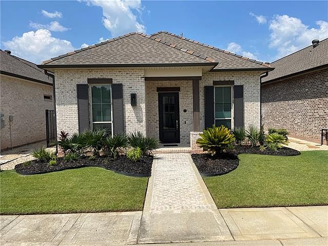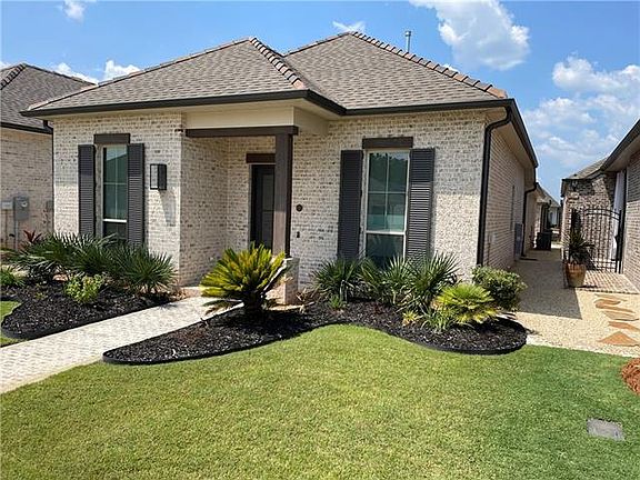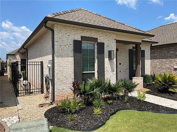 Like NEW Cottage home in the beautiful gated "Maison Du Lac"! The elegant Primary suite has a custom tile shower, huge garden tub, and double vanities. Kitchen has stone countertops and stainless-steel appliances with a gas stove and refrigerator. Enjoy the electronic fireplace for those cozy winter nights while entertaining on the enclosed patio with included patio furniture! Home equipped with Hurricane Shutters, Sprinkler System, Custom Window Shades, and also has a dog run. Also includes a washer and dryer. 3 bedroom 2 bath 2 car garage! Minutes to I-12 and shopping.
