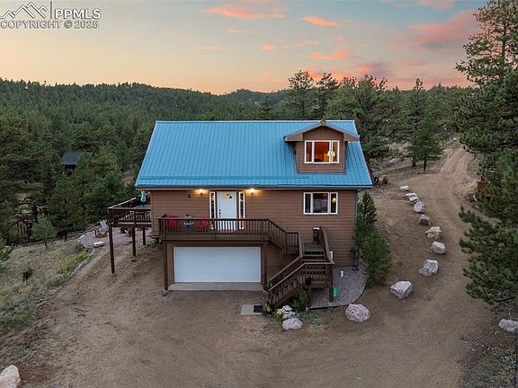 Enjoy lake life just outside your door in this beautiful home, a harmonious blend of modern convenience and alpine warmth. Located in a highly sought-after gated Eleven Mile Ranch neighborhood. Inside, the vaulted tongue-and-groove ceiling frame a bright, open layout. With a statement gas fireplace with river rock surround, you'll stay warm on those chilly nights. A main level bedroom and en suite bath means everything you need is within reach. And with a bedroom on each level, the upstairs one being lofted, it gives all guests the option of privacy and serenity. All modern appliances are included—refrigerator, microwave, trash compactor, dishwasher, oven/range, and washer/dryer. Each room offers some kind of picturesque view, with either mountains, forest, or glimpses of the lake! The private lake offers year-round recreation, including fishing, ice fishing, kayaking, and more! Looking for an easy move? Furnishings can even be negotiated to stay! Recent upgrades include a 2024 radon mitigation system, durable metal roof, and a master bath refreshed with a granite countertop and sink. The freshly stained 500 sq ft deck overlooks a wooded lot with panoramic mountain and lake views. A heated 2-car garage provides year-round comfort, and there’s space for RV parking plus potential carport coverage from the deck for extra protection. Incredible brand new landscaping adds fresh curb appeal! Perfect for recreation, there’s space for kayaks and outdoor gear, plus nearby trail access. Minutes from Eleven Mile Reservoir and Eleven Mile Canyon Recreational Park, ATV routes, hiking trails, and flyfishing. Just over an hour from Breckenridge. Lake George is a true sportsman’s paradise and this home is right in the middle of it. HOA-maintained roads ensure all-year access, with dues covering lake access, snow removal, and more. Come by today to see this stunning home in the only community that has exclusive rights to the town's namesake, the pristine Lake George.