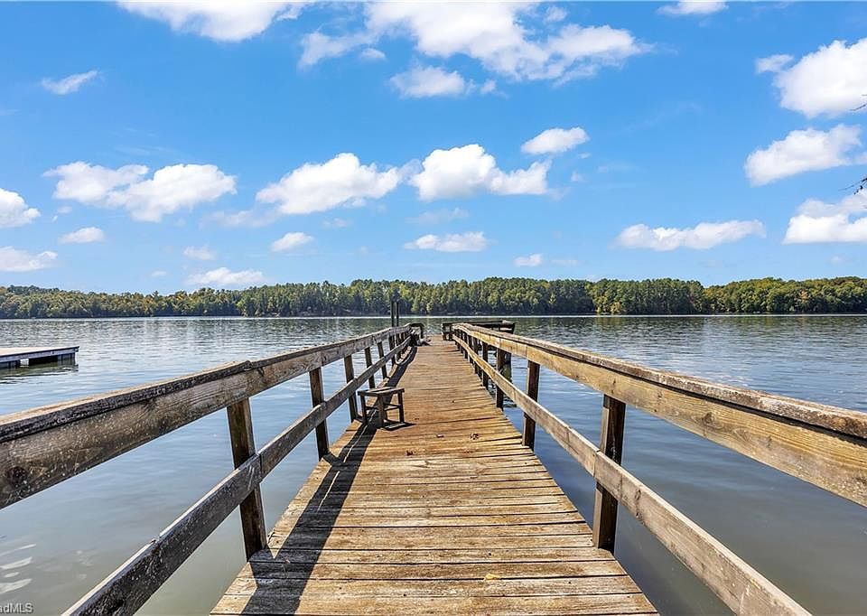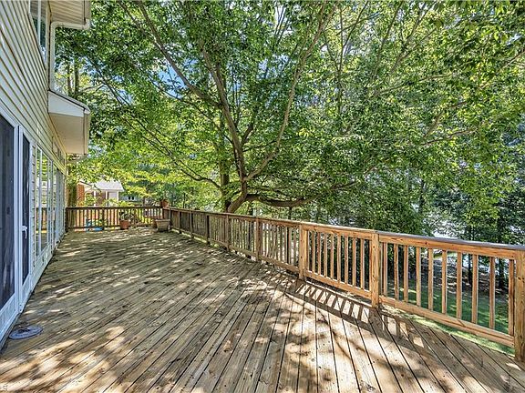 Waterfront with a long pier and exceptional water views! Tucked in an adorable cul-de-sac within popular Anchor Downs, this home is designed for lake living. A large deck overlooks the water, while a screened-in side porch and covered lower patio provide endless outdoor enjoyment. Newer stairs lead from the tall deck to the patio below. Inside, an open floor plan features a kitchen overlooking the great room, complete with a striking stone fireplace and exquisite built-ins. The dining area sits perfectly between the kitchen and great room — all enjoying expansive lake views. Hardwood flooring graces the main level, which includes two ensuite bedrooms. Downstairs, find two more bedrooms with a Jack & Jill bath, plus a second living area with fireplace and wet bar. Outdoor living, indoor charm, and lakefront lifestyle all in one!
