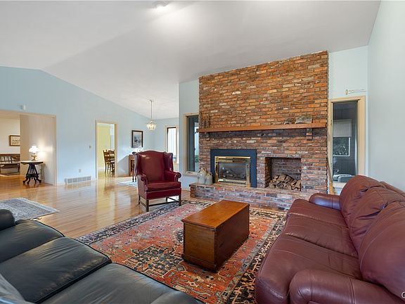 Step through the covered front entry into a bright, inviting foyer that leads to a spacious great room with soaring cathedral ceilings and a dramatic brick gas fireplace—the perfect centerpiece for gatherings or cozy evenings at home. A flexible open area serves beautifully as dining, living, or home office space and flows seamlessly to a screened-in porch, which opens to a private patio and lush backyard oasis.