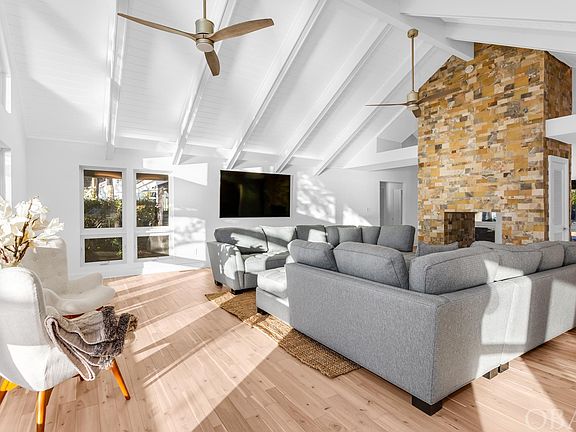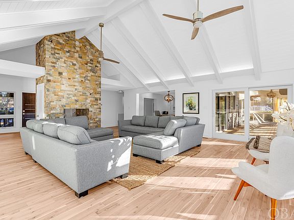 Designed for the modern lifestyle, this coastal contemporary estate has been completely reimagined to offer all the advantages of waterfront living on the Outer Banks. Encompassing nearly 4,639 square feet of light-infused living space, the four bedroom, five-and-one-half-bathroom home is minutes from a plethora of beach accesses, nature inspiring trails, and amenities for the active lifestyle. The home exudes style with a travertine, double-sided fireplace, beamed ceilings, high-end finishes, designer fixtures, and beautiful entry doors. The main level makes up just over 2,900 square feet to accommodate refined entertaining and relaxed daily living. The remodeled chef's kitchen offers top-of-the-line stainless appliances, a leathered granite waterfall island, and a spacious dining table with fixed windows and a sliding glass door that display breathtaking views of the Jean Guite creek. The door to an outdoor porch offers another opportunity to enjoy the stunning views in comfort with two Bromic smart heaters. The primary bedroom is crowned with vaulted ceilings, water views, a loft, built out walk-in closets, two separate vanities, a tiled shower, and a freestanding tub. This level continues with a secondary primary suite, half bath, and office space. The second level is dedicated to a sitting area and two elegant bedrooms with their own ensuite bathrooms. A bonus room awaits up a second set of stairs including a full bathroom and storage space. Additional highlights include a two-car garage with all-weather walls, walk-in closets, plenty of storage, a brand-new dock, a HALO whole home in-duct air purifier, and so much more! You have to see it for yourself!