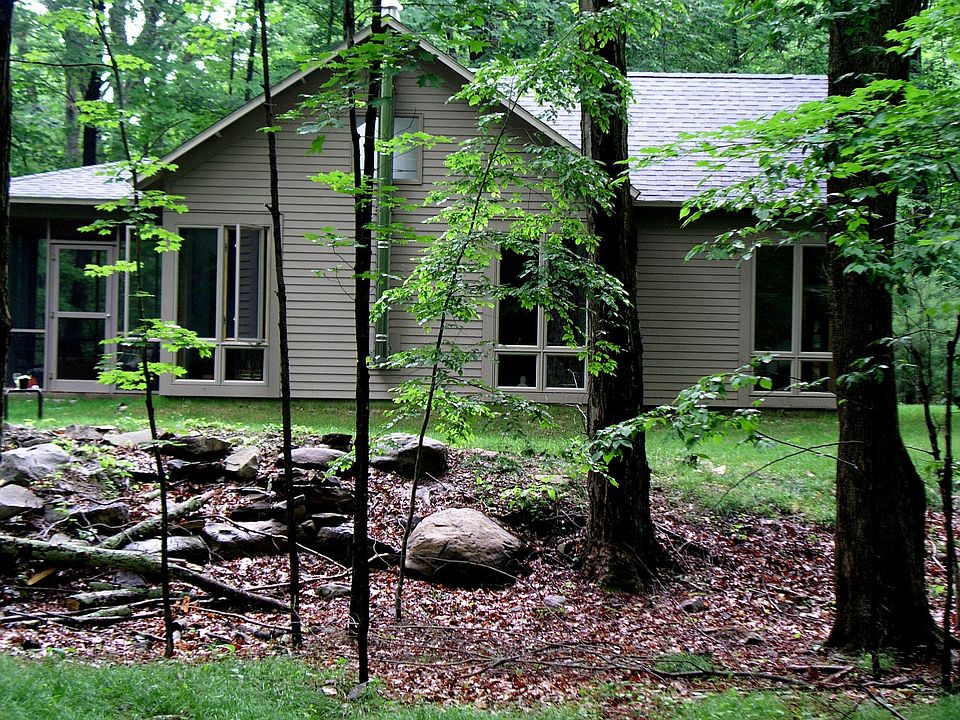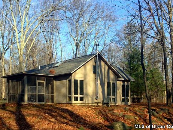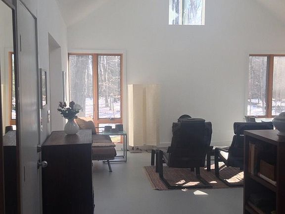 Architect designed home with green sensibility. Privately set off picturesque country road amidst 1.7 acres of light woods and ringed by stone walls this simple yet sophisticated sunfilled contempo has an open interior with concrete floors, lofted ceiling with skylight, radiant heat and central woodstove . Warm, inviting, sleek , energy efficient ... Great screen porch provides a lovely summer room . Very cool, one of a kind house.....
