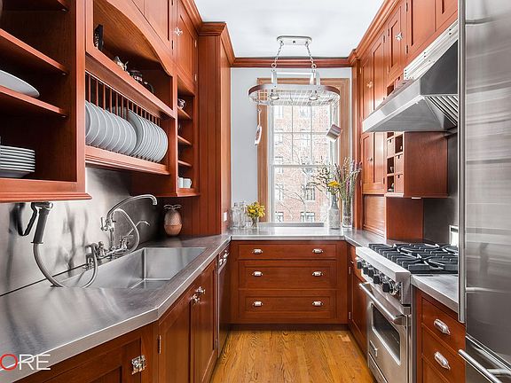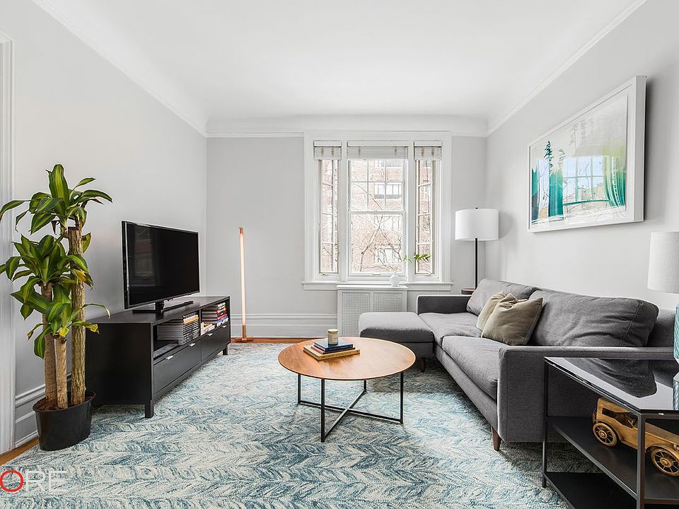 5B is a bright, south-facing, pre-war one-bedroom on idyllic West 12th Street between 6th and 7th Avenues. Perfectly situated where Greenwich Village meets the West Village, this high floor home is a rare find and located within a well-run, boutique elevator co-operative. With 9.5-foot ceilings, south-facing windows in each room and tons of sky from every sight line, 5B receives penthouse caliber sunlight while still maintaining its charming, tree-lined feel. Enter the home through a large foyer with a big coat closet and an etched glass light fixture overhead. The coved ceiling is painted black and immediately sets the tone for 5B's unmistakable pre-war aesthetic. Off the entryway is a fully equipped chef's kitchen with a large casement window overlooking West 12th Street. This rustic yet immaculately maintained kitchen is a room of its own and features custom cabinetry, unique storage features including an appliance garage and wine bottle pantry, stainless steel countertops, a butcher block, a commercial size stainless steel basin sink and a high-end appliance package including a Sub-Zero refrigerator, a Viking stove and a Miele dishwasher. The oversized living room features three south-facing casement windows and lays out as a perfect rectangle, measuring approximately 12 by 18 feet. There is enough space for separate living and dining with several art walls that dramatically anchor the room. The living room is ideal for intimately hosting friends or relaxing among treetops and also offers a massive and cleverly tucked away closet. The newly renovated bathroom is bright, windowed and tastefully appointed with Toto and Restoration Hardware fixtures and a convenient shower/tub combo. Another large closet ideal for linens, cleaning supplies and luggage is right off the bathroom and adjacent to the bedroom. The bedroom is a cozy retreat and can easily accommodate a king size bed plus a dresser or reading chair. There is another generously sized closet in the bedroom with both shelving and hanging space. If you're in pursuit of a pre-war home with southern light and iconic Village views of the Jefferson Market clock tower, look no further. 5B is not only perfectly laid out and proportioned, it is also move-in ready and offers tons of storage. 125 West 12th Street is an established co-op consisting of 34 homes, a live-in superintendent, laundry in the basement, bike storage and very reasonable monthly carrying costs.