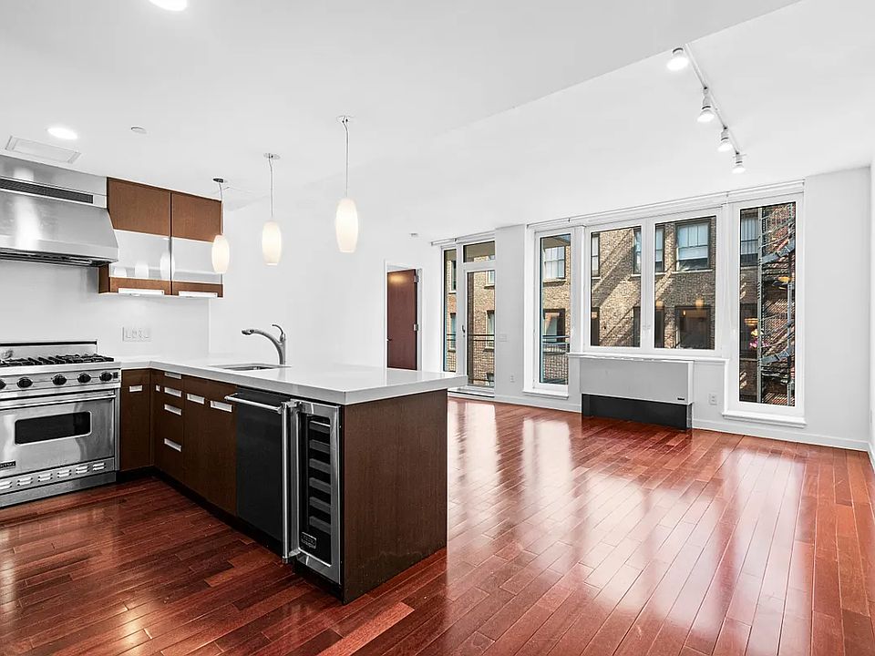 The open-concept living and dining area has expansive floor to ceiling windows. The gourmet chef's kitchen features Poggenpohl cabinetry, Caesarstone countertops, and a large breakfast bar. Integrated Viking appliances include a refrigerator, dishwasher, built-in microwave, and wine cooler. A vented washer and dryer are in the powder room.