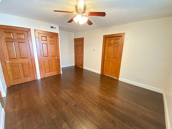 Waterfall showerStainless steel appliancesStunning vanityHardwood floorsCeiling fansMirrored closet doorsBeautiful black slate tile
