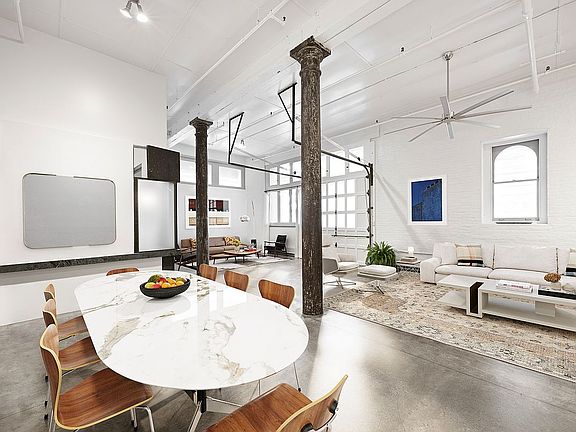 Set in an intimate six-story building in prime Northwest Tribeca, the home features dramatic 13’8” ceilings, original structural columns, and oversized north- and west-facing windows that bathe the space in natural light. Signature design details—polished concrete floors, exposed whitewashed brick, a roll-up garage-style door, and a bold metal spiral staircase—create a sense of authenticity and creativity throughout.