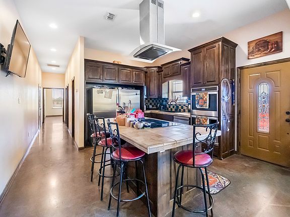Inside, you’ll find open-concept living framed by arched entries, exposed beams, and stained concrete floors. The gourmet kitchen features a large island, granite countertops, and custom cabinetry, flowing seamlessly into a warm and inviting living area centered around a stone fireplace. The primary suite is a peaceful escape with a spa-style bath and balcony views overlooking the property, while each additional bedroom offers generous space and private or shared baths. With a private casita, inground pool and multiple bonus rooms, this home offers flexibility for a home office, media room and unique outdoor entertainment.