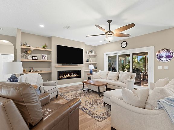 Don’t miss this beautifully renovated home in the sought-after Eagle Bend Island community! Nestled on a private 1.3-acre lot, this stunning property offers over 2,600 sq ft of open-concept living space with a 3-bedroom, 2.5-bath ranch-style layout. You’ll enjoy 9-foot ceilings and elegant light-colored porcelain tile flooring throughout. The spacious gourmet kitchen is a chef’s dream, featuring a 36” Thor Gordon Ramsay range, a Z-line vented hood, granite countertops, a large island, and a full-height granite backsplash. The expansive great room includes a sleek recessed electric fireplace flanked by custom built-ins—perfect for entertaining or relaxing. The primary suite is a true retreat, complete with direct access to the screened lanai, updated vanities, and right-height elongated fixtures. The lanai features new stackable sliders and upgraded pavers, offering a perfect blend of indoor-outdoor living. Additional highlights include: A 2-car garage with an extended driveway—ideal for multiple vehicles, RV, or boat parking, Brand new windows and doors installed in 2024, Updated HVAC system (2022), Central vacuum system (updated 2025), 615-ft deep artesian well, Fresh interior paint 2025 & exterior paint in 2020 This home truly feels like new and is just minutes from a nearby boat ramp—perfect for water lovers!
