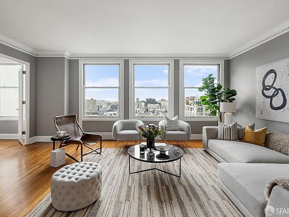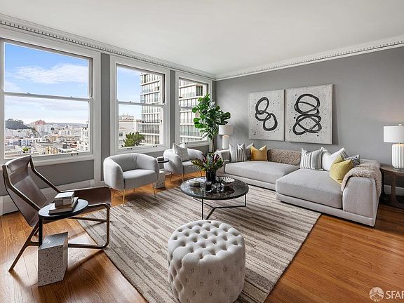 Perched atop Nob Hill in San Francisco's iconic Art Deco landmark, this 1,250 sq. ft. corner home blends timeless elegance with thoughtful modern upgrades. A reimagined floor plan with two full baths rare in the building and windows on three sides fills the interiors with light and sweeping views toward Pacific Heights, the Presidio, and the San Francisco skyline. The entry foyer, illuminated by Murano glass lighting, opens to gracious living and dining spaces with crown molding, hardwood floors, and classic craftsmanship. The chef's kitchen features natural stone counters, mill-grade cabinetry, pantry storage, and premium Bosch appliances with dual sinks. The primary suite enjoys a corner orientation, peek Bay views, generous storage, and an artisan-tiled en-suite bath with a multi-fixture tub and shower. A second full bath stuns with mosaic detail, while in-unit laundry enhances convenience. Building amenities include 24/7 door person service, private storage, a residents-only patio, and a large parking space that fits 1+ cars.