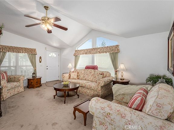Lovely manufactured home located in the desired senior 55+ gated community of Foothills of Hemet, and as a bonus has an attached 2-car garage. Enjoy your mornings or evening on your porch overlooking your lush green yard & shade tree. Home has very spacious primary bedroom & bathroom w/step-in shower. Guest bedroom at the end of the hallway w/guest bathroom right next door to it. The third bedroom which has double door entry is being used as an office since it doesn't have a closet. Kitchen is light & bright with lots of cabinetry that opens up to the dining and living room areas. Inside laundry room also has a pantry closet in it. Covered back patio for entertaining. The park is clean, quiet, gated and just plain awesome with amenities including 2 swimming pools, spa, pickleball courts, air-conditioned shuffle board court, exercise room, recreation hall w/kitchen, and rooms to enjoy billiards, cards, bingo, crafts & fun planned dinners or activities. Ask about the park's RV parking area. Commuter friendly, and close to shopping & restaurants.