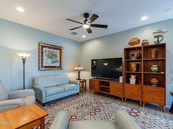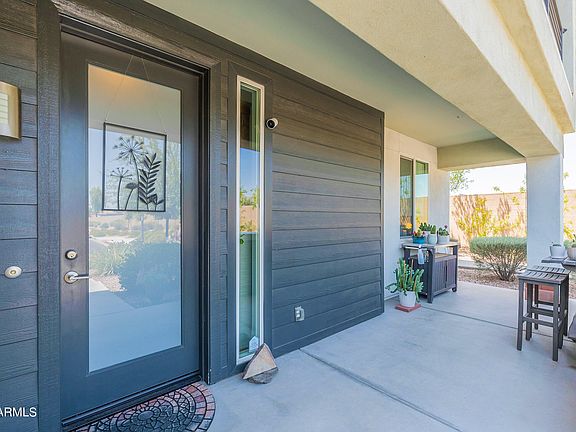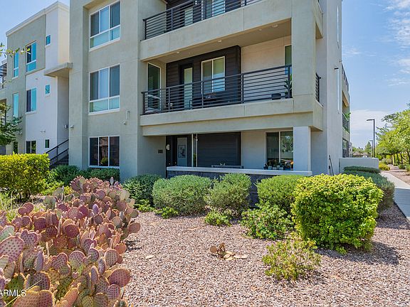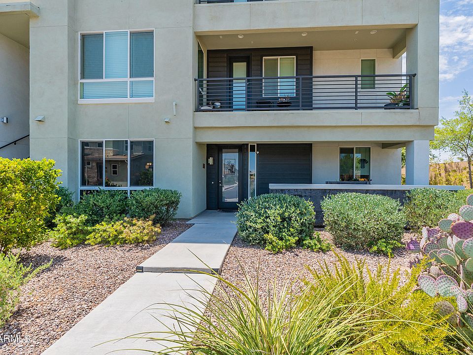 Hard to find, turnkey, single level, first floor condo in RHYTHM. North/South facing, bright end unit with open feel. True pride of ownership is felt throughout. Upgraded kitchen open to family room, with breakfast bar, granite countertops, large cabinets, with under-mount lighting, built in appliances and glass backsplash. Primary bedroom w/ 2 large closets, one with beautiful barn door. Upgraded baths. Crown molding throughout. Windows have heat/UV coating and roller shades. Extra storage throughout unit, and in oversized tandem garage. Very Private end unit within Rhythm. Border Tempe/Chandler and walking distance to AJ's, shops and restaurants!