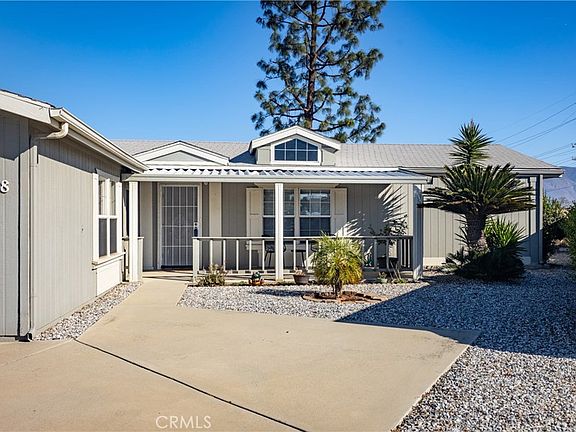 This home located in the desired & gated 55+ senior community of Foothills of Hemet was totally remodeled a few years ago & well cared for so it's like new. Wall to wall luxury vinyl plank flooring. Light & bright kitchen and the third bedroom which doesn't have a door both open up to the living room making the area very open & inviting. Primary and other guest bedroom are spacious. Ceiling fans & newer A/C keep you comfortable all year long. There is also an oversized one car garage (plus extra parking in the front yard which is fantastic) and a breezeway between the primary bedroom & the garage that is great for storage. Easy maintenance yards, and in the back there is a very nice covered patio, The front porch is a lovely place to relax with your morning coffee or enjoy the evening sunsets & breezes. The home itself sits on one of the largest lots in the park, backs up to Commonwealth with gorgeous mountain views and no neighbors behind you. The park is clean, quiet, gated and just plain awesome with amenities including 2 swimming pools, spa, pickleball courts, air-conditioned shuffle board court, exercise room, recreation hall w/kitchen, and rooms to enjoy billiards, cards & crafts. Ask about the park's RV parking area. Commuter friendly, and close to shopping & restaurants.