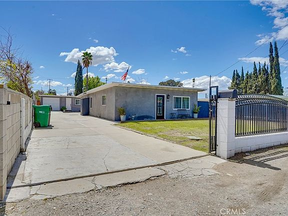 Upon entering the property's gated entrance, you are greeted by a spacious lot with a long concrete driveway, providing ample parking for numerous cars. The exterior has been beautifully re-stuccoed and painted, enhancing its curb appeal.
