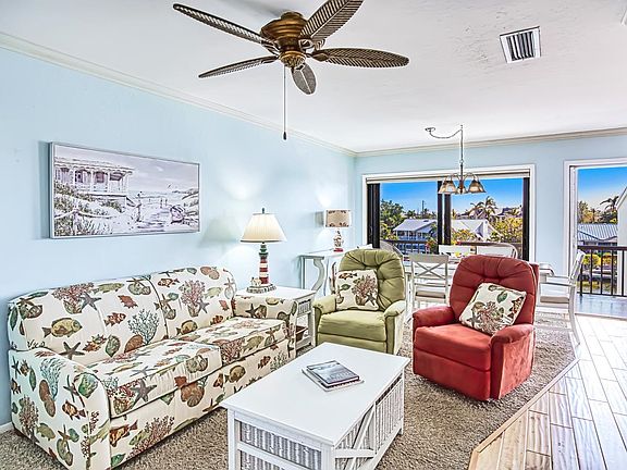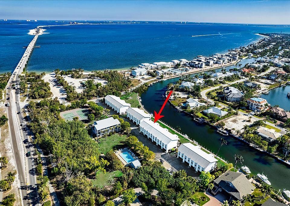 Enjoy stunning water views and direct boating access to San Carlos Bay in just one minute from this beautifully remodeled 2-bedroom, 1-bath end-unit in Tennisplace. Move-in ready, it features birch hardwood flooring in the main living areas and plush carpet in the bedrooms. The fully renovated kitchen showcases Pompeii Sunny Pearl quartz countertops with embedded shells, custom cabinetry, and sleek modern finishes. Both the primary and guest/office bedrooms include custom-built cabinetry for maximum storage and functionality. Impact windows and slider with plantation shutters provide style, energy efficiency, and peace of mind. An extra bonus is the brand-new washer & dryer in the unit—a rare convenience in this community. Step out onto the open porch overlooking the wide navigable canal, where dolphins and manatees are frequent visitors and boat slips are right in your backyard. The sale also includes a 2-seater kayak, making it easy to start enjoying the water right away. Additional perks include assigned covered parking, exterior storage, and a private bike rack. HOA has no special assessments, and the community has been freshly updated with new roofs, recently painted buildings, and updated landscaping. Tennisplace is a boater’s and beach lover’s paradise with easy on-and-off island access and resort-style amenities: heated pool, tennis courts, kayaking, paddle boarding, and deeded beach access just a short walk or bike ride away. The community also allows flexible rentals—minimum 2 weeks in peak season (Feb–Apr) and 1 week the rest of the year—making it an excellent investment opportunity.