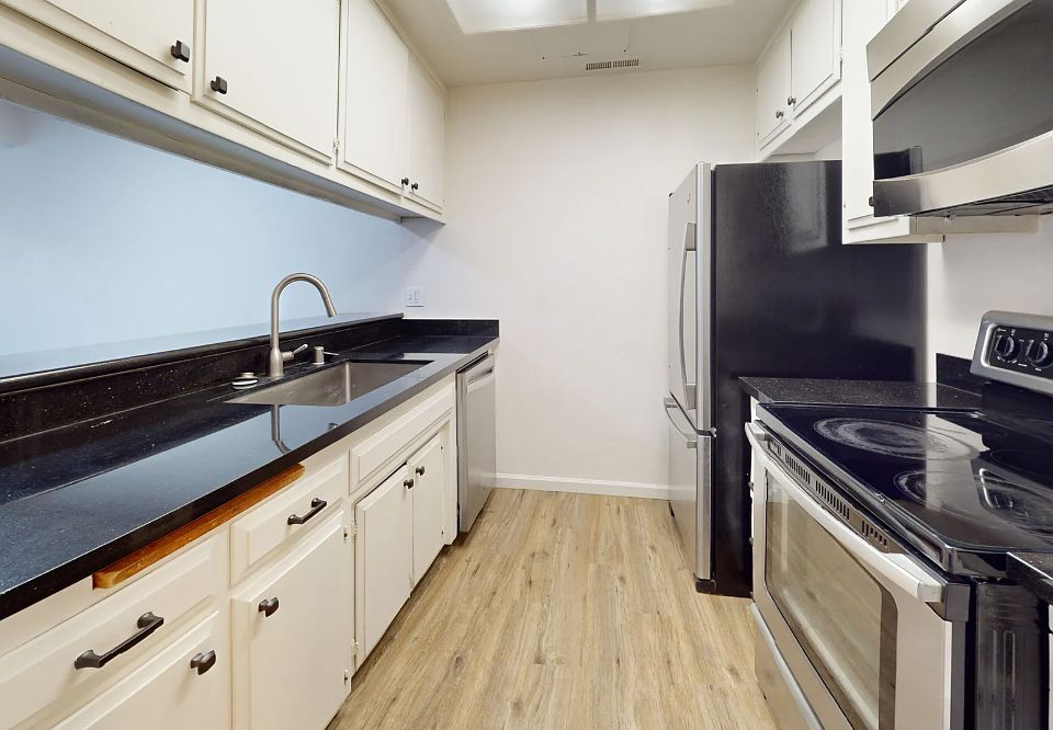 Covered parkingCharming private patioWhite cabinetrySleek contemporary fixturesBlack granite countertopsUpdated appliancesModern kitchen