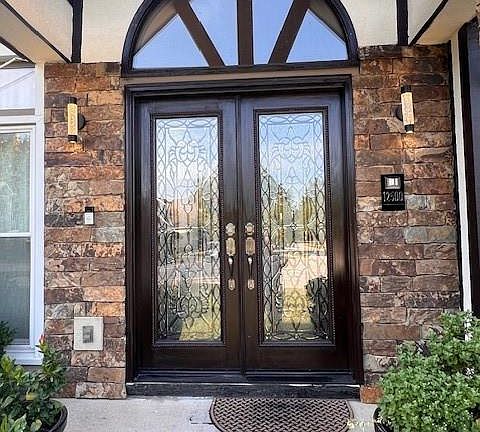Fireplace stacked stoneWood flooringOven rangeNeutral colorsGarage doorsKitchen cabinetsQuartz counter tops