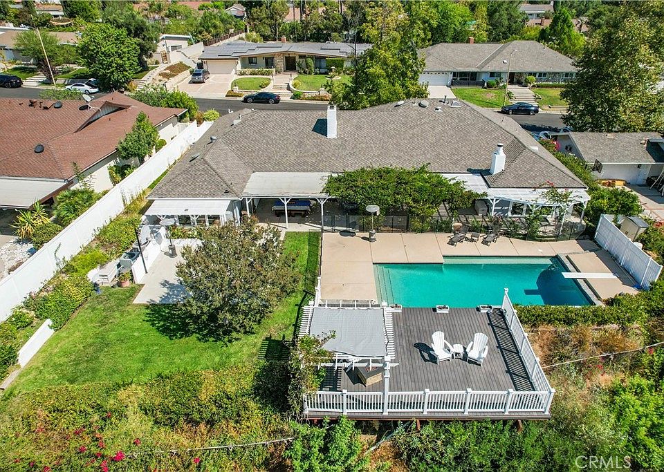 The large updated kitchen features a center island, stainless steel appliances, ample storage, and a cozy eating area, making it the heart of the home. Designed for versatility, the home includes a separate wing with two bedrooms and a remodeled bathroom, ideal for generational living. The remaining four bedrooms are located on the other end of the home. The spacious primary suite is a retreat in itself with a fireplace, glass slider to rear yard, double walk-in closets and an enormous primary bath with dual sinks and separate shower and tub. The other three good sized bedrooms, each have access to their own baths. The expansive 18,033 sq ft lot is a private entertainer’s paradise, complete with an oversized patio, lush grass area, sport court, refreshing pool, impressive deck overlooking the golf course and valley views. This well-maintained home boasts numerous updates, including wood flooring, updated HVAC systems, newer dual water heaters, updated windows and doors, and remodeled baths. With recessed lighting and thoughtful design touches throughout, every corner of this home exudes charm and functionality. Located close to shopping, dining, and easy freeway access, this home truly is an ideal place to call your own. Experience the best of Southern California living in this exceptional property!