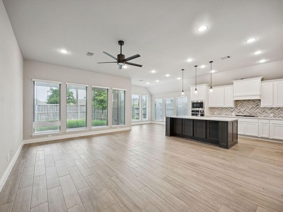 Located in the acclaimed Aliana master-planned community and zoned to top-rated Fort Bend ISD schools, this stunning one-story Perry Home is only 5 years old and filled with energy-saving features. The open-concept layout offers a bright kitchen with tall windows, a large island, walk-in pantry, and beautiful arches leading into the main living areas. Cool vaulted and tray ceilings, high ceilings throughout, and custom blinds and shades add elegance and comfort. A dedicated home office with French doors provides the perfect work-from-home space, while the second bedroom includes an attached bath—ideal for guests or multi-gen living. Enjoy outdoor relaxation on the covered patio surrounded by professionally landscaped grounds. Gutters have been added for extra protection. Aliana offers miles of trails, tennis courts, pools, and more. The Perry Homes 10-year structural warranty is transferable. Conveniently located near major highways, shopping, and dining—this home truly has it all!