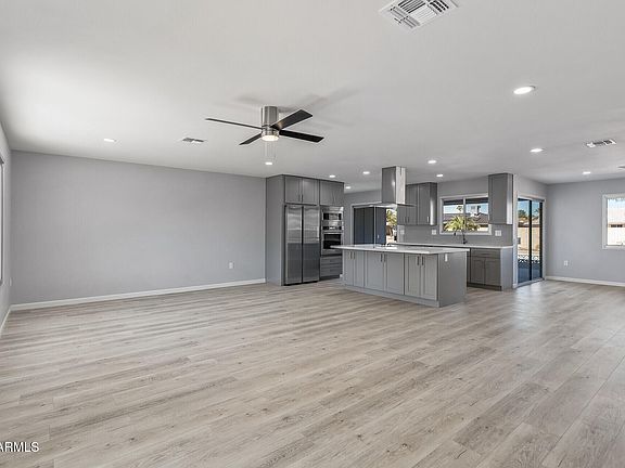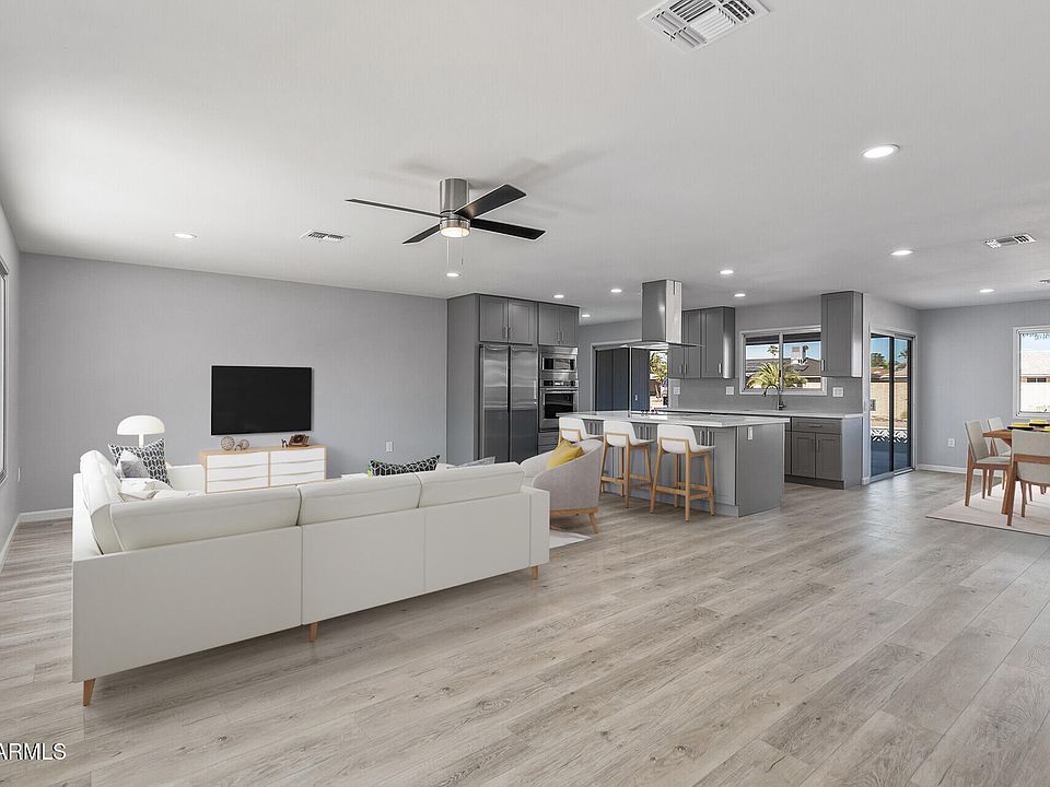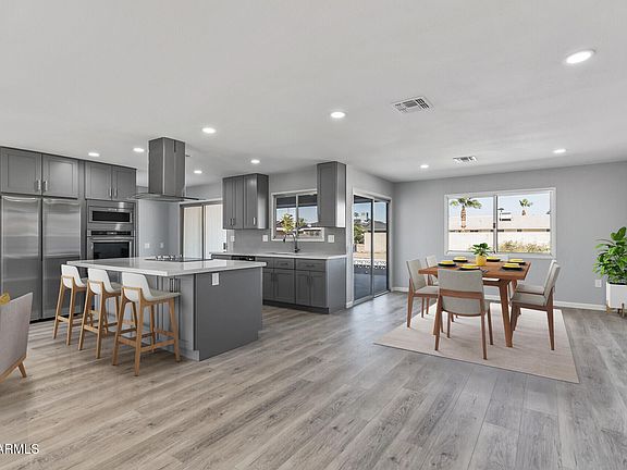 GREAT NEW PRICE for this TOTALLY remodeled mid-century home seamlessly blends modern design with timeless charm! The popcorn ceilings are gone, replaced by sleek can lighting. Walls were removed to create a spacious great room layout perfect for today's lifestyle, LVP flooring throughout the home. Both bathrooms have been fully updated with step-in showers, stylish vanities, and new toilets. The kitchen boasts updated stainless steel appliances, an added island, and modern finishes. A generously sized utility room offers space for laundry, crafts, or even a home office. Situated on an expansive 11,690 sq. ft. corner lot, the backyard features a large covered patio—perfect for relaxing or entertaining. Roof & AC new in 2024! Located in the highly desirable 55+ community of Sun City West!