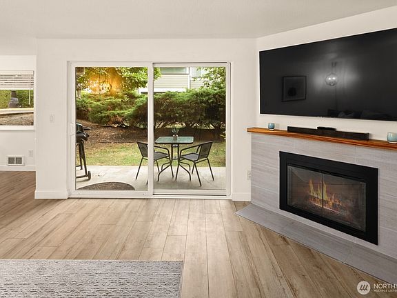Rare corner, ground-floor end unit—beautiful updates and truly move-in ready. Sun-filled, warm-contemporary style: light luxury-vinyl floors, crisp white walls, black metal lighting, and a modern black kitchen with gold hardware and an earthy tile backsplash. The open living/dining space feels airy and welcoming, perfect for everyday living or easy entertaining. Quiet building location tucked at the very back of the complex, with your own covered parking spot and lots of guest parking! Ample storage space. Live minutes from The Village at Totem Lake (dining, shops, medical, entertainment) and walking distance to Safeway. Park the car and enjoy the neighborhood. Well-run community in a prime Kirkland/Totem Lake spot with fast I-405 access.