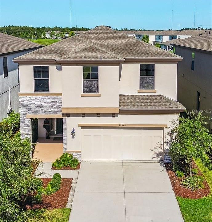 Welcome to the WESTBAY Cypress model. A builder known for UPGRADED FINISHES and charming design that perfectly blends comfort and style.+++++ VA ASSUMABLE LOAN OF 2.25% WITH LENDER APPROVAL++++++ A covered entryway opens to the foyer and leads into an airy, OPEN CONCEPT main level featuring a spacious downstairs office/playroom/formal dining room, eat-in kitchen, and great room. A gourmet kitchen with GE appliances, Moen faucets, Timberlake cabinetry, Ashen Gray Corian QUARTZ countertops, and Pantry. Sliding doors from the great room extend your living space onto the covered lanai with a beautiful sunset waterview—ideal for outdoor entertaining. Upstairs, you’ll find all 4 bedrooms thoughtfully tucked away for privacy and relaxation, along with a huge 18'x 13" Bonus area. The downstairs main living areas feature Legacy 7x22 Sterling wood-look tile, providing a warm and stylish finish. Located in Hawkstone, a master-planned community in Lithia, residents enjoy resort-style amenities, an A-RATED NEWSOME HIGH SCHOOL, and access to the natural beauty of the area. Explore pet-friendly hiking trails at the 969-acre Triple Creek Nature Preserve just minutes away, or enjoy the excitement of Triple Creek BMX nearby. With easy access to US-301 and I-75, everything you need is within reach.