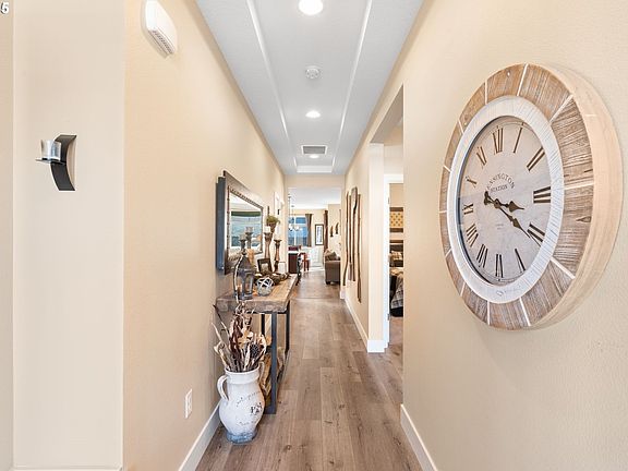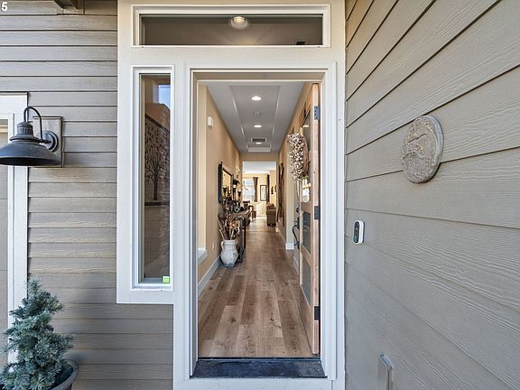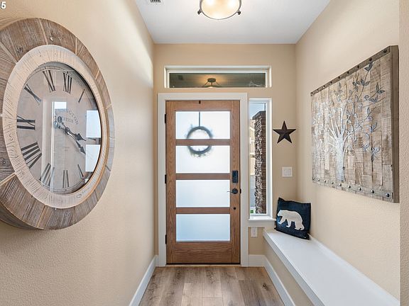 Welcome to this stunning 2022-built home by Pacific Lifestyle Homes, where modern design meets timeless elegance. This single-level residence features an open-concept layout, seamlessly connecting the living, kitchen, and dining area—perfect for both daily living and entertaining. Gorgeous wood floors flow throughout the home, complementing the warmth of the brick fireplace in the great room. The kitchen boasts a spacious island perfect for food prep, homework, entertaining, or casual conversations, along with a walk-in pantry and ample cabinet storage. Adjacent to the great room, the primary bedroom features extra windows, and a barn door leading to the en-suite bathroom with a dual-sink vanity, large walk-in closet, and walk-in shower. Two additional bedrooms, thoughtfully positioned on the opposite side of the home, offer privacy and versatility—perfect for guests or a dedicated home office. Step outside to a covered patio, complete with a custom fire pit, ideal for year-round enjoyment. The professionally manicured, low-maintenance yard enhances the home’s curb appeal and provides a peaceful outdoor escape. This home offers the perfect combination of comfort, style, and functionality, making it an ideal place to create lasting memories.