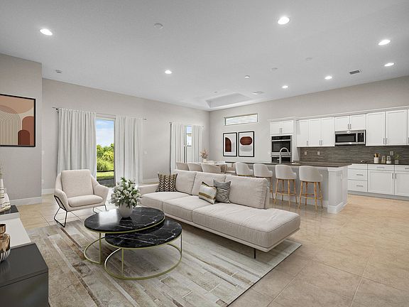 This welcoming 2 bedroom, 2 bath plus den home provides soothing colors indoors and out. The Island elevation with 4' garage extension is accented with blue and white tones. The interior is inviting with white and grey tones in the kitchen with upgraded tile backsplash, glass cooktop and double wall oven, plus 3 boxes above the kitchen island for future pendant lights. The laundry room is finished with upper and lower cabinets including a drop-in laundry tub. The office is accented with double single-lite glass French doors. Pocket door at master bath water closet. Tile flooring throughout the home plus a floor outlet and 4 hi hats in great room. The lanai is finished with an exterior wall mount TV package.