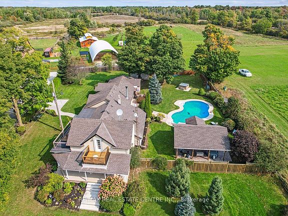 Dream Estate with Endless Possibilities Minutes from the GTA. Discover this exceptional property set on acres of rolling countryside, offering a beautiful home complete with an in-law suite, two kitchens, two living rooms, a great room, and two laundry rooms. Oversized principal rooms create the perfect setting for entertaining, while the spacious kitchen, featuring quartz counters and a large centre island, makes cooking and baking a true pleasure. Step outside to your private retreat: a 20 x 40 inground pool, expansive yard, oversized pavilion, and professionally landscaped gardens. A bright sunroom spans the front of the home, overlooking lush gardens and horse paddocks. Accented with commissioned artwork by a renowned Toronto artist. The property is equally impressive for potential equestrian and agri-business pursuits. Highlights include a 6-stall horse barn, large bank barn with new stabling, orchards, a Mennonite-built marketplace with ice cream and bakery display equipment, a picnic area with stage, extensive paddocks with underground water and power, and a 40 x 80 coverall with lighting. Conveniently close to the GTA, this property also benefits from Halton's new bylaw allowing additional residential units on rural lands unlocking incredible potential. Whether you envision a family estate, farm, market, or Agri-tourism venture, the opportunities here are endless. The retiring vendor welcomes you to bring your vision to this extraordinary, ready-to-go property and make your dream a reality.
