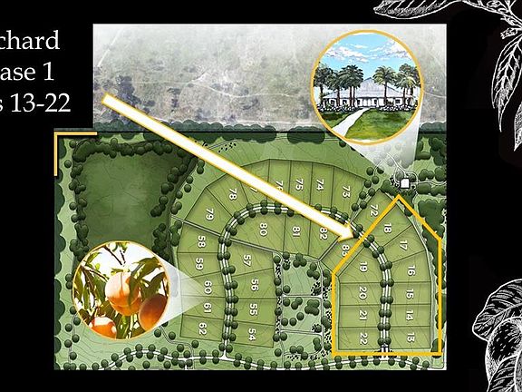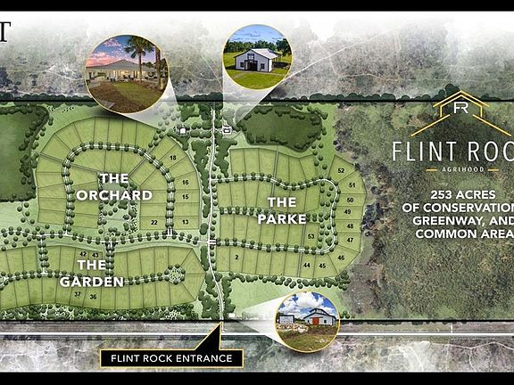 Lot 22 is a one acre corner lot. Its south facing backyard spans 150 ft in the back, abutting the Orchard’s unique U-shaped common space. Gainesville’s first Agrihood, Flint Rock promotes a lifestyle of healthy living and wellness, carefully crafted to embrace the farm-to-table lifestyle. This luxury residential community is centered around its recreational spaces, nature trails, gardens, orchards and conservation preserve. With 2.5 miles of walking paths and expanses of land, its residents will enjoy more green space than your average Gainesville subdivision. Owners will have access to their Event Barn, a unique venue for hosting outdoor activities. The Residents’ Farmhouse offers a catering kitchen with spacious indoor gathering areas, surrounded by a fire pit area for casual outdoor entertaining. Offering expansive green space, The Orchard gated subdivision has a unique U-shaped center that is almost 9 acres in size, featuring a collection of fruit and nut bearing trees along paved community walking paths.