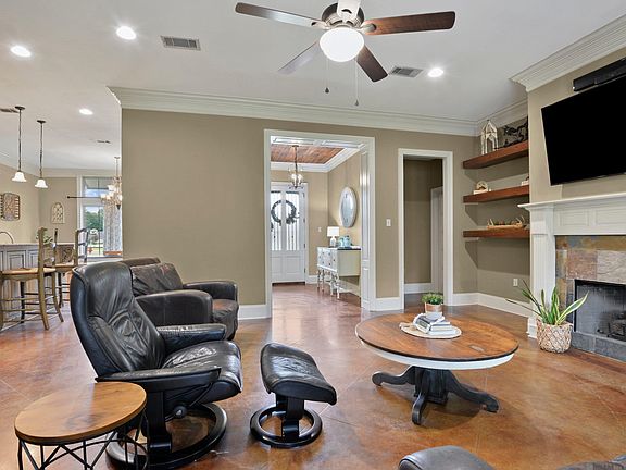 Located on the largest lot in the neighborhood, this corner-lot custom home features a 3-car, 1,000 sq ft garage, an extra-wide driveway, fenced backyard, and expansive patio perfect for outdoor living. Exterior highlights include eave lighting, a brand-new Atlas 35-year roof, and a generator power transfer hookup. Inside, 11’ ceilings, triple crown molding, stained concrete floors, and custom millwork elevate every space. The foyer showcases a rustic wood ceiling and custom entry molding, while the living room and master bath include custom floating shelves. The triple split floor plan provides optimal privacy and function. The kitchen is finished with custom cypress cabinetry and a spacious walk-in pantry behind an antique rustic door. The dedicated office includes a built-in desk, and all closets feature custom built-in shelving. The guest wing includes a Jack and Jill bathroom. The master suite offers a recessed ceiling with ambient lighting, a double vanity, soaking jacuzzi tub, separate shower, and walk-in closet. Additional features include a tankless water heater, brand-new interior AC unit, a home alarm system, and two attic access points with decked flooring for storage. Neighborhood amenities include access to a stocked pond and a private playground. All located in the highly rated Live Oak School District.