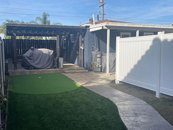 Backyard has a new vinyl privacy fence, putting green/chipping area, 500 sq ft covered patio with a fire table eating area.