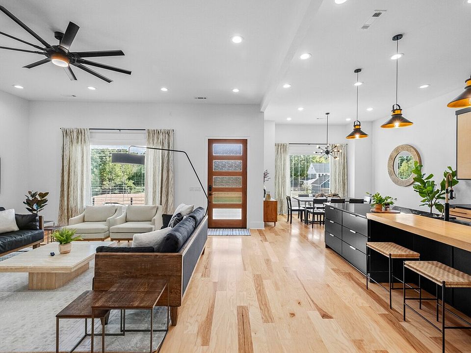 The Fillmore offers a blend of luxury and convenience, nestled on a quiet street in the heart of Downtown Bentonville. Just seconds from Slaughter Pen MTB Trail and a mere mile to Downtown, this home is perfect for groups of up to 10, featuring four private king-size bedrooms. The curated outdoor living space includes a hot tub, 'Solo Stove' fire pit area, outdoor dining area, and BBQ grill. Inside, enjoy a game room with a shuffleboard table, wet bar with mini fridge, and retro arcade game with Pac-Man.