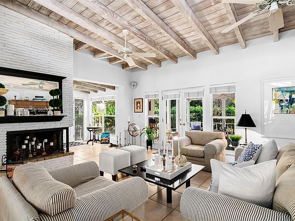This 3-bedroom, 3-bathroom 3,386 SF home is on one of the most desirable streets in Pinecrest, on an expansive 40,510 SF lot. The residence exudes charm with a covered porch entry, a large side covered porch, with a sprawling layout showcasing stunning exposed vaulted whitewash beam ceilings . The light and bright eat-in kitchen has custom cabinetry with ample storage, wall pantry, a large center island, beautiful marble countertops, and a breakfast dining area. Perfect for entertaining, the beautiful and serene backyard includes a sizable, covered terrace and pool. Additional features include a two-car garage, partial impact windows and doors, and two fireplaces. A prime location in one of the best school districts.