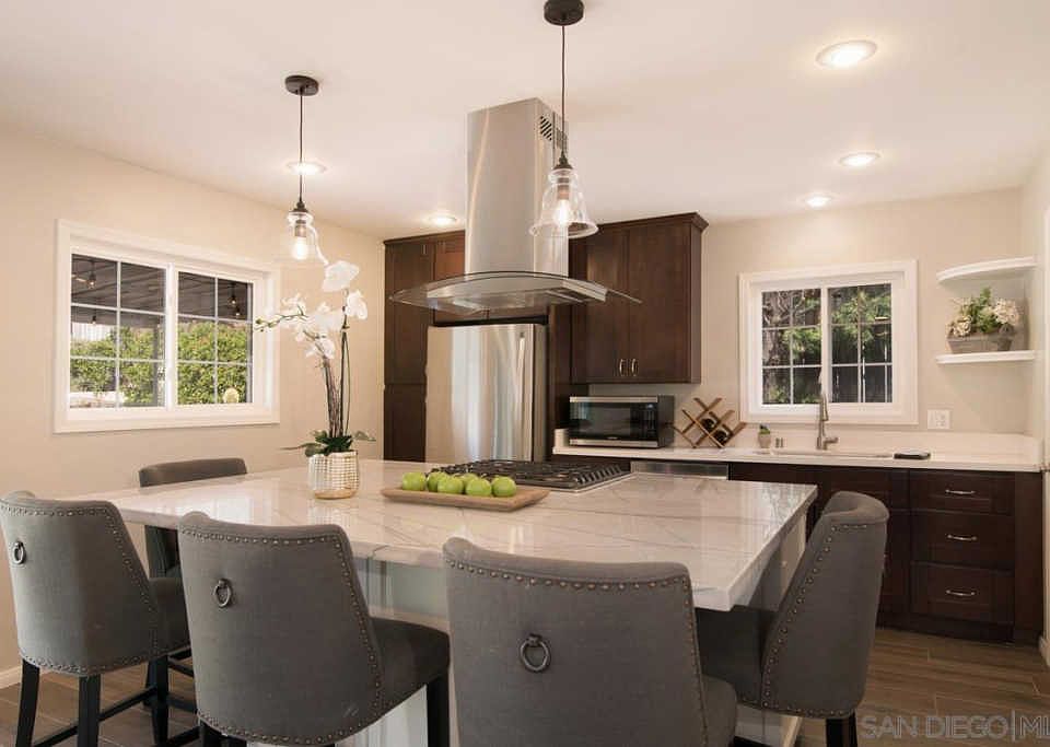 $699,900 - $759,900. Great Poway location. Single level with 4 Bedrooms 2 Baths, remodeled kitchen, eat at center island seats 5, quartz countertops, gas range with stainless steel drop hood. Other upgrades include dual pane windows and slider, updated bathrooms, "wood look" tile flooring in the entry, LR & KT. Both bathrooms have had the plumbing re-piped and newer interior paint. 2 car attached garage, large backyard with covered paver tile patio.