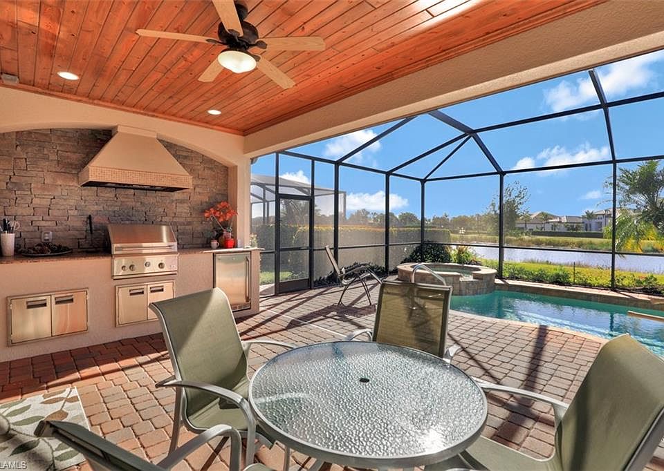 This rarely found Isabella floor plan listing in TwinEagles features 3 bedrooms plus den and 3 FULL BATHROOMS (rather than the normal 2). *FULL GOLF MEMBERSHIP WITH THIS HOME* Southern exposure with tranquil lake and golf course views add to the outdoor Florida living you come to expect in Naples. This home features a customized den with built-in desk, cabinets and Murphy bed, perfect to accommodate guests. Other home features include large tile flooring and tray ceiling & crown molding in main living areas, open and split bedroom floor plan, and an oversized screened lanai with plenty of covered space, a full outdoor kitchen, and a pool and spa. Featuring Impact Glass Windows and Sliders. Very well maintained and many upgrades to be enjoyed. Twin Eagles offers 36 holes of world-class golf, dining and fitness and a variety of social activities. The Club is undergoing an exciting transformation of facilities including the Talon golf course and Clubhouse, that must be seen.