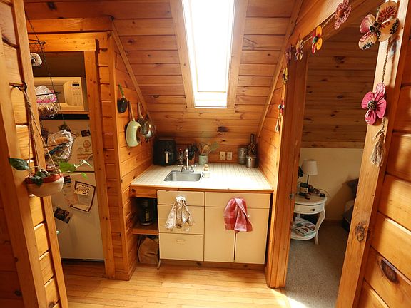 This apartment is the upper floor apartment with it's own private entrance in a home located in a quiet, wooded setting with a small stream. Each floor is an apartment and is considered separate from the other floors. It has a convenient two minute drive to a park, Greenway Trail access, and Booneshine Brewing Co. It is a nine minute drive to downtown Boone and Appalachian State University. This 400 sq. ft. apartment gets flooded with natural light from abundant windows and a skylight and has beautiful wood plank walls, ceilings, and flooring. This apartment has just a kitchenette, meaning it does not have a stove/oven. The kitchenette has a skylight, recessed lighting, tile countertop with sink, abundant storage space, and refrigerator/microwave. The living room and bedroom have ceiling fans. There is a stacked washer and dryer in the apartment. Gravel off street parking space is provided. Cooling is ceiling fans and no AC. Rent includes electric, water gas heat, and wifi internet. Rent is to be paid through an online portal that has transaction fees of $1.95 per ACH transaction or 3.5% + $0.30 per credit card transaction may apply. 12 month lease only. Pets: Cats OK with paid pet fee. Living room - 15' x 11' Bedroom - 10' x 11' Kitchenette - 10' x 4' Bathroom - 10' x 8' This lease is for a single occupant only. No double occupancy. Pet fees (cats only) are $200 non-refundable per pet due at lease signing. Owner pays electric, water, gas heat, Internet, and lawn maintenance. Tenant is responsible for trash disposal, snow removal, and optional renter's insurance, and telephone.