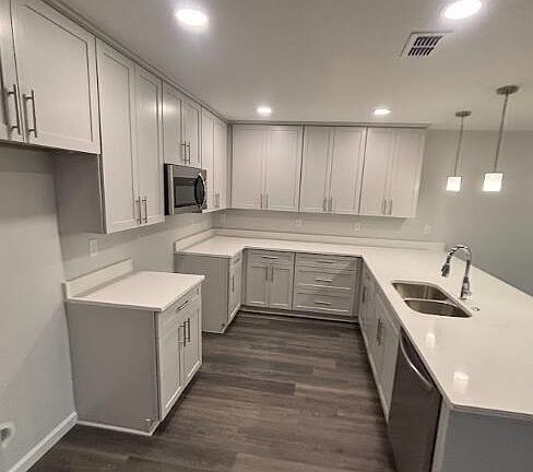 Covered lanaiGranite countertopsCarpet in bedroomsWood-look vinyl plank flooringWhite cabinets