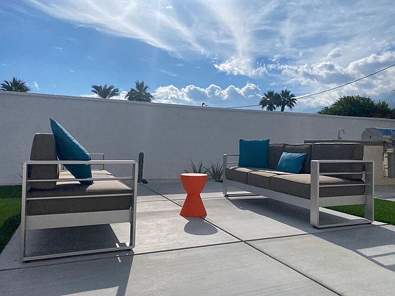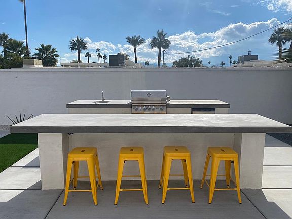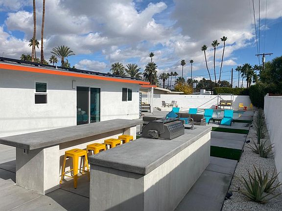 Fully restored, and packed with the latest features, this Mid-Century Modern classic was originally designed by Meiselman. That design has been updated to make your stay luxurious and comfortable. Brand new salt water pool with daybed and loungers, oversized salt water hot tub, outdoor kitchen and bar, outdoor fire pit for S'mores, new kitchen/bar seating, separate wet bar, 3 master suites with bathrooms, dining area, and comfy seating around the fireplace, too. Powered with clean energy and backup if power goes out!
