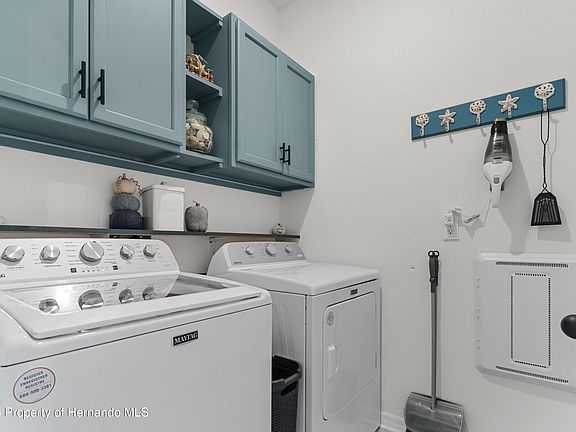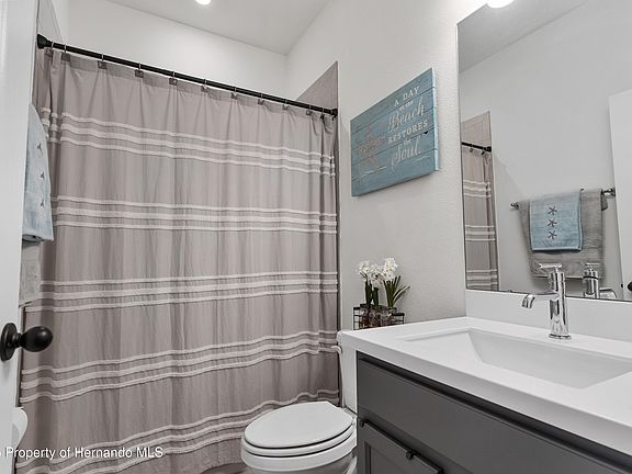 The home boasts a large 3-bedroom 2 bathroom split floor plan design. The 1509 square feet feels larger in person with its 9'4 ceilings. The layout is an open concept kitchen that features 42- inch cabinets, stainless steel appliances, quartz counter tops and bar stool seating. Tile flooring is throughout the main living area and comfort carpet in the bedrooms. The spacious master bedroom highlights his and her closets, double vanity sinks and an oversized walk-in shower. Loaded with options this home is a must see. The home is in the beautiful subdivision, Villages at Avalon. This community includes a club house, fitness center and lap pool. It has low HOA and No CDD. It's conveniently located near the Suncoast Expressway for easy-commute, grocery stores, shopping hiking trail, Weeki Wachi and much more. Come see what everyone is talking about in the Villages at Avalon.