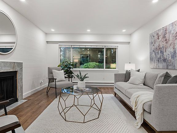 Great value for this updated 2BR / 1BA ground level home in Pemberton Heights - one of the North Shore's most desired neighbourhoods. An elegant living room features a wood fireplace, recessed lighting and a large window with a tranquil, treed view. The fully updated kitchen features stainless steel appliances, stone counter tops and lots of cabinet space with room for a dining table. The laundry room has additional storage and side by side machines. A clean, modern black and white theme in the fully updated bathroom. The primary bedroom has a private treed view and both bedrooms are well sized. This corner unit features a spacious enclosed patio area great for summer barbecues plus covered parking, storage locker. Pet friendly, reasonable number of cats/dogs allowed. Capilano IB catchment